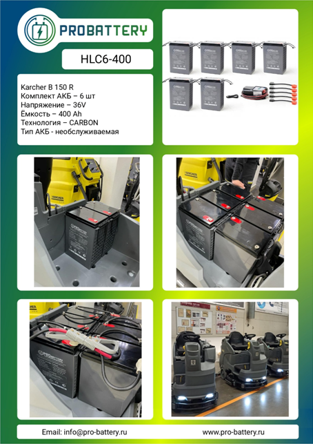 Не упустите возможность обновить свою уборочную машину KERCHER B150 с помощью качественных свинцово-углеродных аккумуляторов HLC6-400. Закажите свой аккумулятор уже сегодня и наслаждайтесь высокой энергоэффективностью и надежностью в работе.